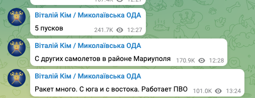 Губернатор Николаевской области Виталий Ким пишет о большом количестве российских ракет, запущенных с юга и востока. В частности, из района Мариуполя.