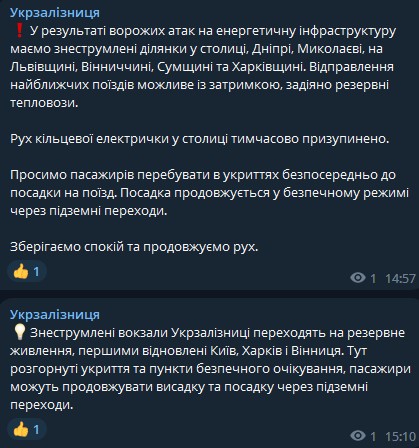 Укрзализныця сообщает о последствиях прилётов: обесточены участки в столице, Днепре, Николаеве, Львовской, Винницкой, Сумской и Харьковской области.