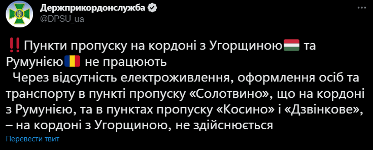 "Из-за отсутствия электропитания, оформление лиц и транспорта в пункте пропуска "Солотвино" на границе с Румынией, и в пунктах пропуска "Косино" и "Дзвинково", - на границе с Венгрией, не осуществляется", - сообщает Госпогранслужба.