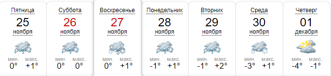В эти выходные, 26 и 27 ноября, синоптики предупреждают об ухудшении погодных условий. Прогнозируют дождь и мокрый снег, иногда налипание мокрого снега и гололедицу. Температура воздуха в центральных регионах максимально прогреется до +2°С, ночью ожидается до -1 мороза.