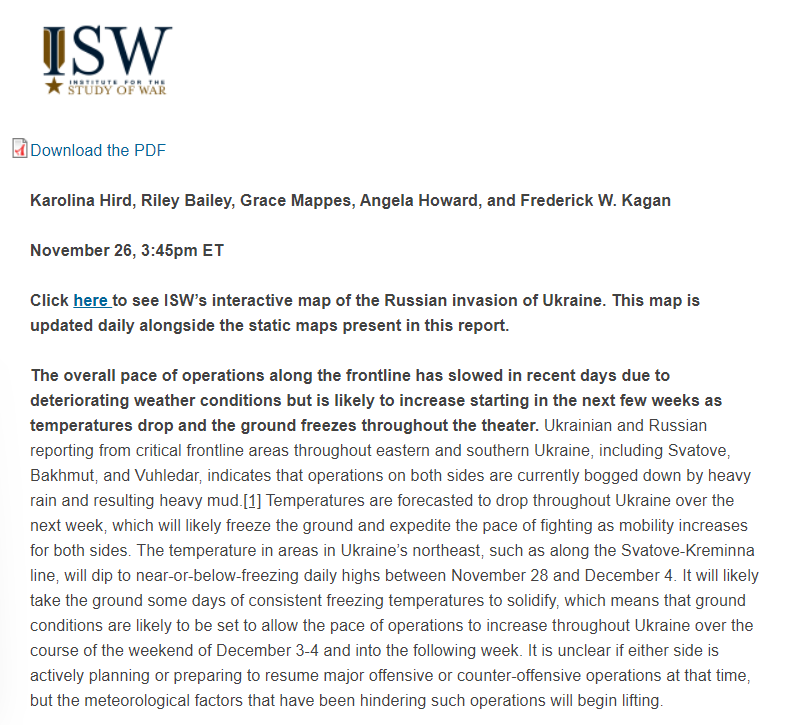 "Температура в районах на северо-востоке Украины, например, вдоль линии Сватово-Кременная, с 28 ноября по 4 декабря упадет почти до нуля или ниже ее дневного максимума. Вероятно, земле потребуется несколько дней при стабильных отрицательных температурах, чтобы затвердеть", - пишет "Институт".