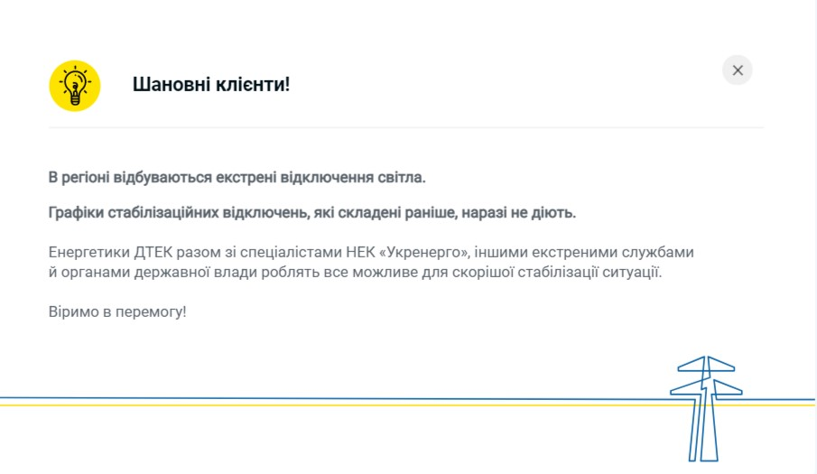 "Составленные ранее графики стабилизационных отключений пока не действуют. Энергетики ДТЭК вместе со специалистами НЭК "Укрэнерго", другими экстренными службами и органами государственной власти делают все возможное для скорейшей стабилизации ситуации", - сообщает ДТЭК.