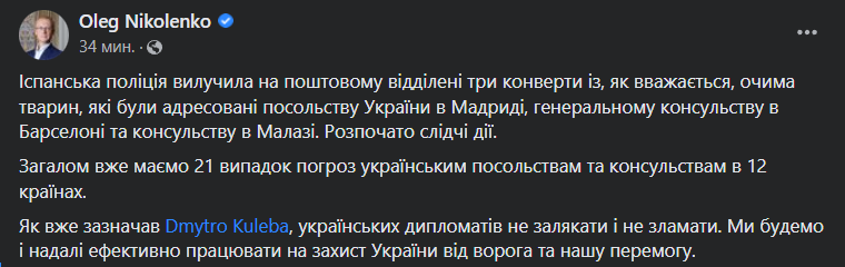 "Всего уже имеем 21 случай угроз украинским посольствам и консульствам в 12 странах. Как уже отмечал Дмитрий Кулеба, украинских дипломатов не запугать и не сломать. Мы будем и дальше эффективно работать на защиту Украины от врага и нашу победу", - написал Николенко.