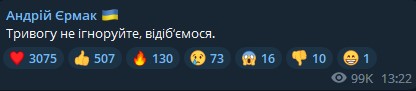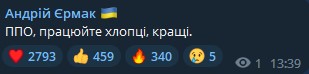 Тем временем, глава Офиса президента Украины Андрей Ермак написал в своем телеграм-канале: "ПВО, работайте парни, лучшие".