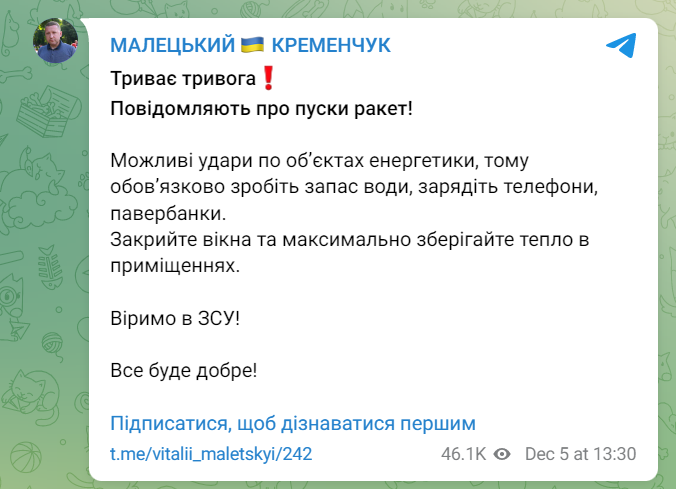 "Сообщают о пусках ракет! Возможны удары по объектам энергетики, поэтому обязательно сделайте запас воды, зарядите телефоны, павербанки", - пишет мэр.