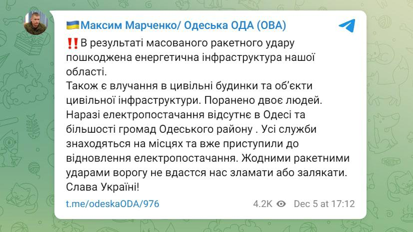 "В результате массированного ракетного удара повреждена энергетическая инфраструктура нашей области. Также есть попадания в дома и объекты гражданской инфраструктуры. Ранены два человека", - пишет Марченко.
