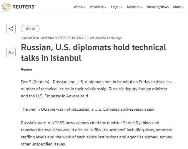 Война в Украине не обсуждалась, заявил представитель посольства США. По его словам, "высокопоставленный чиновник Госдепартамента находился в Стамбуле, чтобы встретиться с российскими собеседниками по узкому кругу двусторонних вопросов".