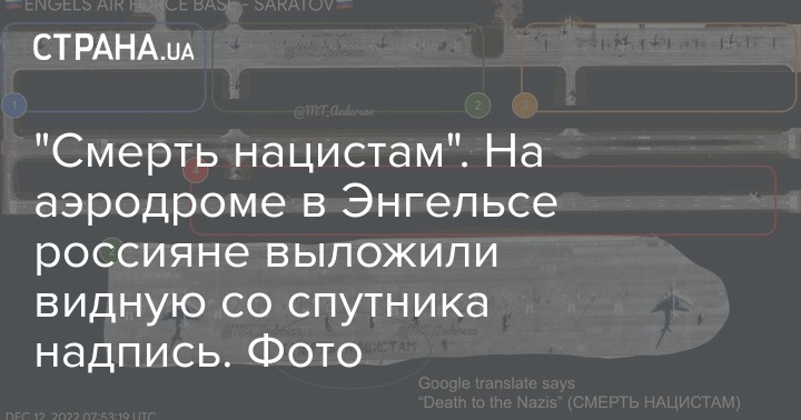 Российские телеграм-каналы публикуют спутниковые фото со ставшего известным аэродрома в Энгельсе Саратовской области, где создали читаемую со спутников надпись "Смерть нацистам".