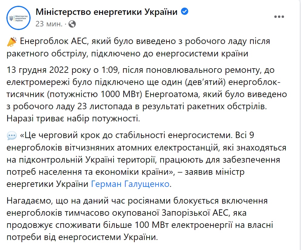 В ночь с 12 на 13 декабря к энергосистеме Украины подключили уже девятый энергоблок-тысячник (на 1000 МВт). Сейчас он набирает мощность.