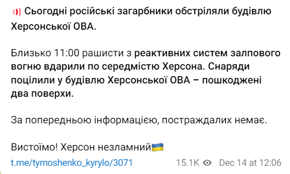 Сегодня российские войска обстреляли здание Херсонской ОВА. Об этом сообщает замглавы Офиса президента Кирилл Тимошенко в своем телеграм-канале.
