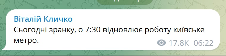 07:50 Киевское метро с утра 17 декабря восстановило свою работу после вчерашней ракетной атаки.