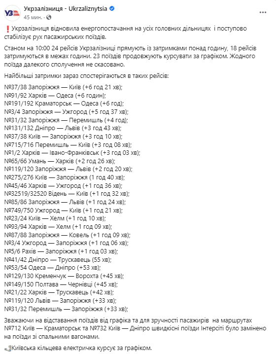 Несмотря на возобновление энергоснабжения на главных участках, многие поезда идут с нарушением графика. Фото: Facebook