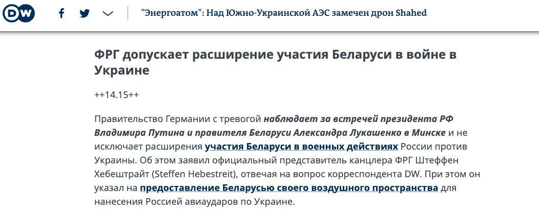 14.51 Берлин опасается, что после встречи Путина и Лукашенко (https://t.me/stranaua/81300) Беларусь расширит свое участие в войне РФ против Украины.