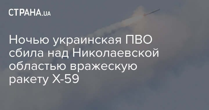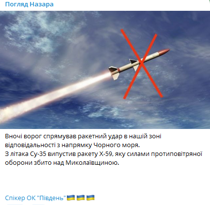 "Ночью враг направил ракетный удар в нашей зоне ответственности с направления Черного моря. С самолета Су-35 выпустил ракету Х-59, которая силами противовоздушной обороны сбита над Николаевской областью", - сообщил Назаров.