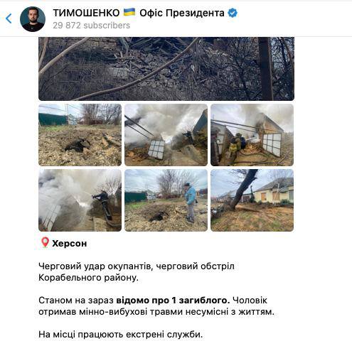 В Херсоне в результате новых обстрелов погиб как минимум один человек. Об этом сообщил замглавы Офиса президента Кирилл Тимошенко на своей странице в телеграм-канале.