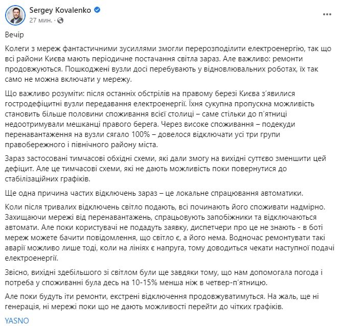"Что важно понимать: после последних обстрелов на правом берегу Киева появились остродефицитные узлы передачи электроэнергии. Их совокупная пропускная возможность составляет более половины потребления всей столицы – именно столько же до пятницы недополучали жители правого берега…