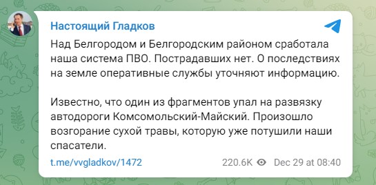 Гладков заявил, что система ПВО сработала над Белгородом и Белгородским районом.