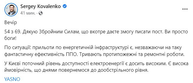 Об этом сообщил в Facebook в четверг, 29 декабря, гендиректор Yasno Сергей Коваленко.