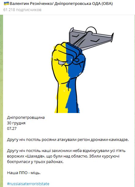 Ночью 30 декабря Днепропетровскую область атаковали дроны-камикадзе.