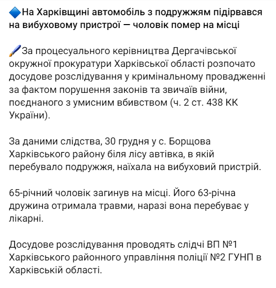Ранее мы писали, что в Харьковской области 28 декабря на мине, оставленной российскими войсками, подорвался 7-летний мальчик, ему на помощь побежал отец, который также наступил на взрывное устройство.