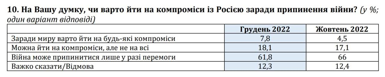 61,8% опрошенных украинцев считают, что с Россией не нужно идти на компромиссы ради мира и что война может закончиться только в случае победы.