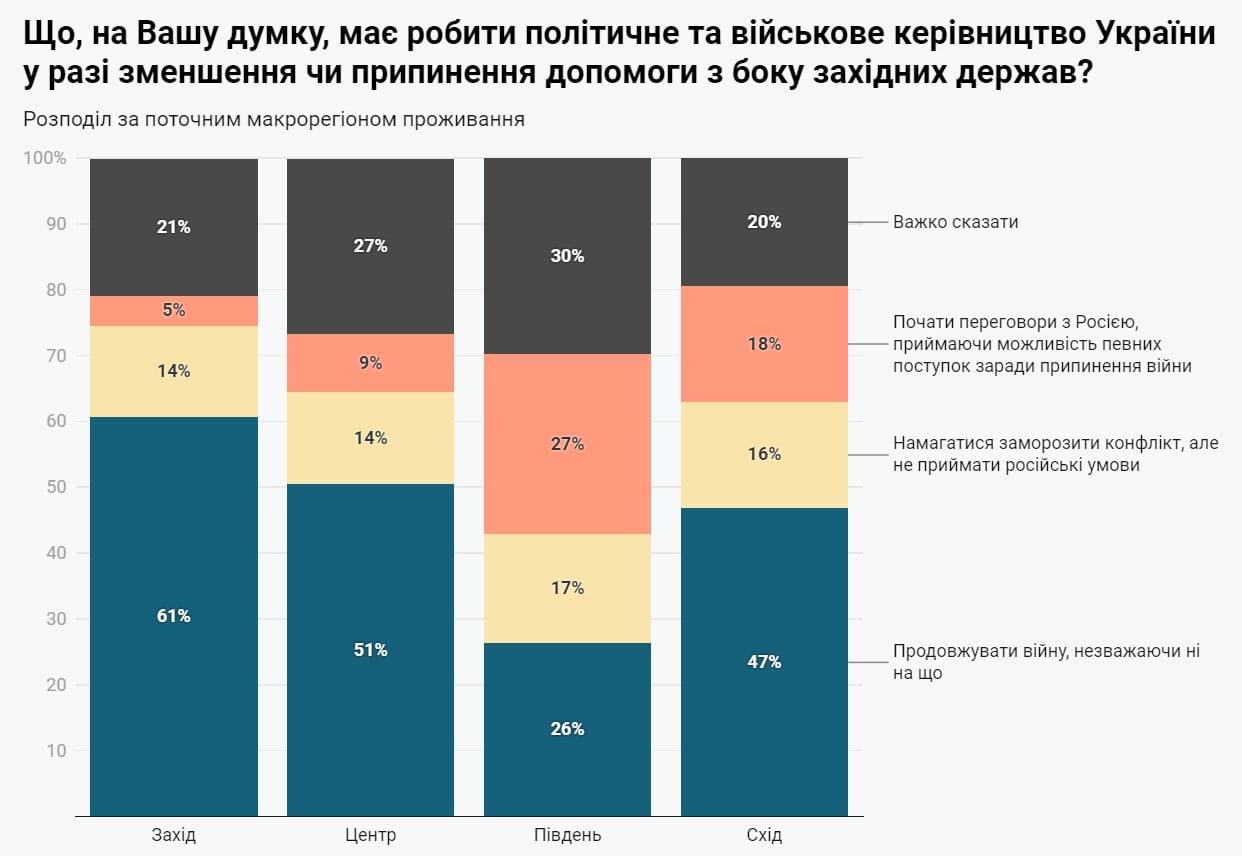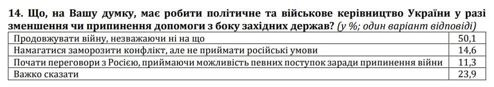 50,1% украинцев считают, что руководство Украины должно продолжать войну даже если западная поддержка уменьшится, 14% согласны на решение заморозить конфликт при таком сценарии, 11% - начать переговоры с РФ, 23,9% - затруднились с ответом.