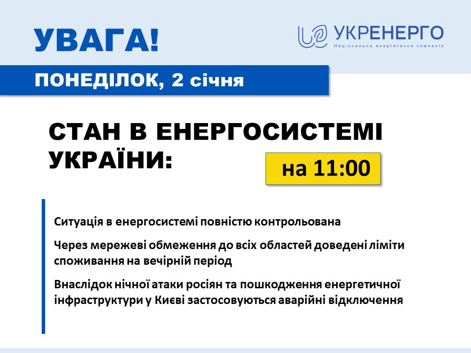 В ночь на 2 января россияне атаковали дронами энергетическую инфраструктуру страны, есть повреждения. Однако по состоянию на 11:00 ситуация в энергосистеме полностью контролируется.