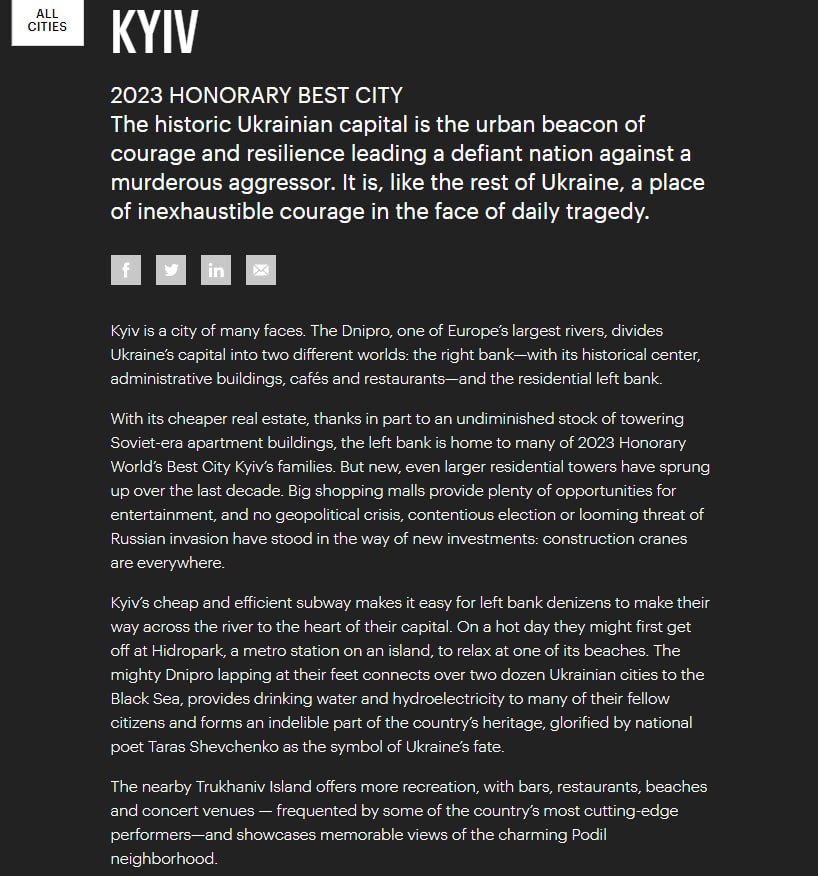 "Историческая столица Украины является городским маяком мужества и стойкости, ведущих непокорный народ против кровавого агрессора. Как и вся Украина, это место неистощимого мужества перед лицом ежедневных трагедий", - говорится в описании к карточке Киева.