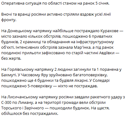 Ночью и утром 5 января россияне продолжили обстреливать населенные пункты Донецкой области.