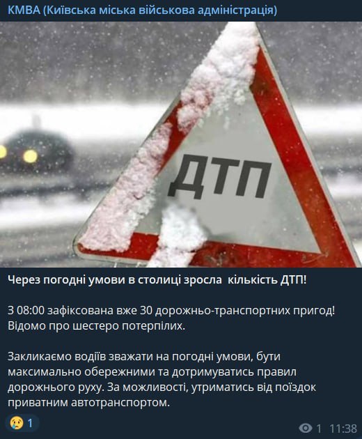 В Киеве выросло число ДТП на фоне ухудшения погоды. С 08:00 понедельника, 9 января, зафиксировано уже 30 аварий.