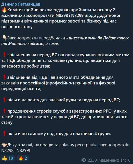 Комитет Рады по финансам, налоговой и таможенной политике рекомендовал принять за основу два законопроекта - №8298 и 8299, по налоговым и таможенным льготам во время военного положения.