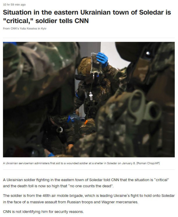 Украинский солдат из 46-й аэромобильной бригады, сражающийся в Соледаре Донецкой области, сообщил, что ситуация "критическая", а число погибших настолько велико, что "никто не считает погибших".