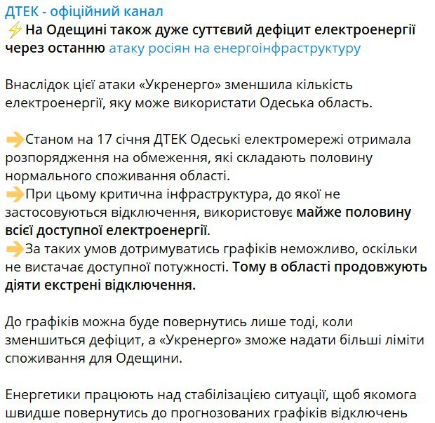 ДТЭК сообщает о большом дефиците электроэнергии в Одесской области. В регионе продолжают действовать экстренные отключения света.