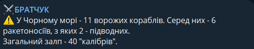 "В Черном море – 11 вражеских кораблей. Среди них – 6 ракетоносителей, из которых 2 – подводных. Общий залп – 40 "калибров", - написал Братчук.