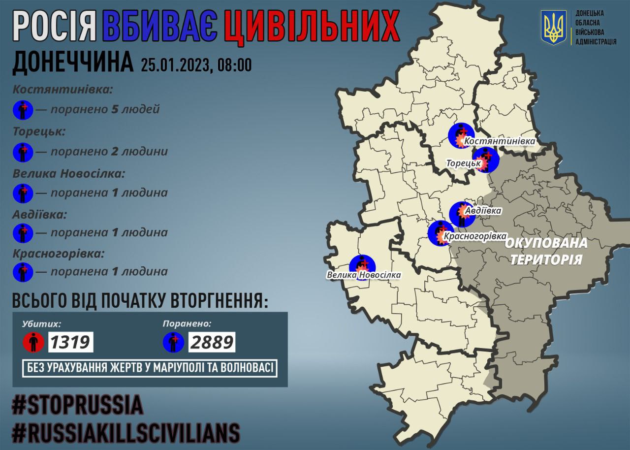 За минувшие сутки 24 января россияне ранили 10 жителей Донецкой области.