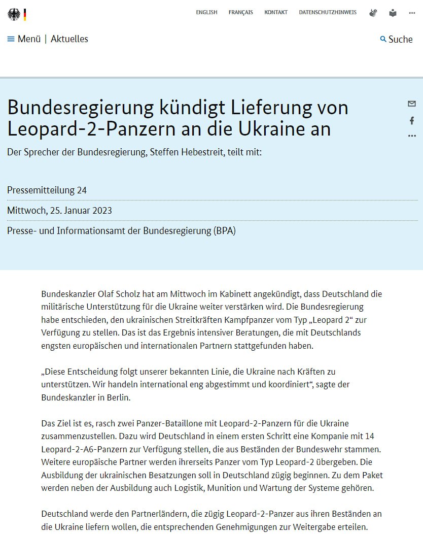 Правительство Германии официально объявило, что направит Украине 14 танков Leopard 2. Также Берлин одобрил разрешение и на отправку данных танков из других стран Европы.