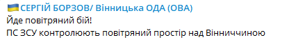 По словам главы Винницкой ОВА Сергея Борзова, "идет воздушный бой, ВС ВСУ контролируют воздушное пространство над Винницкой областью".