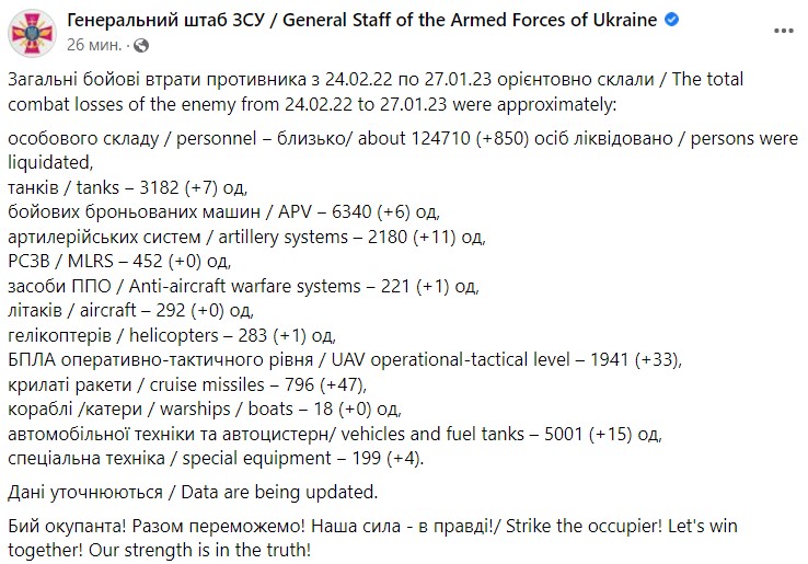 Генштаб Вооруженных сил Украины (ВСУ) озвучил общие боевые потери армии РФ за время войны в Украине - с 24 февраля по 27 января.