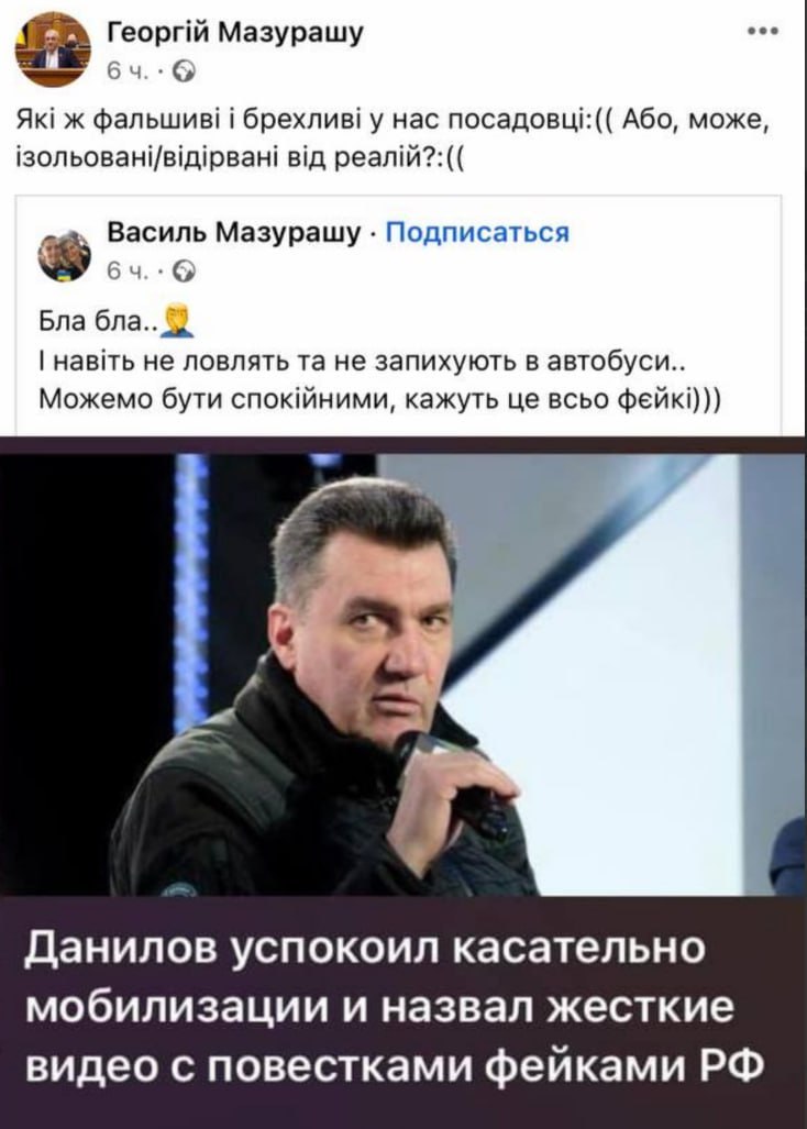 Так нардеп подписал у себя на странице в Facebook скриншот новости с заголовком "Данилов успокоил касательно мобилизации и назвал жесткие видео с повестками фейками РФ".