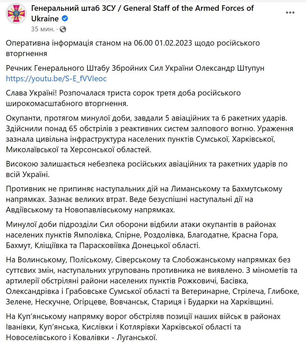 07.15 Сводка Генштаба на утро 1 февраля. Главное: