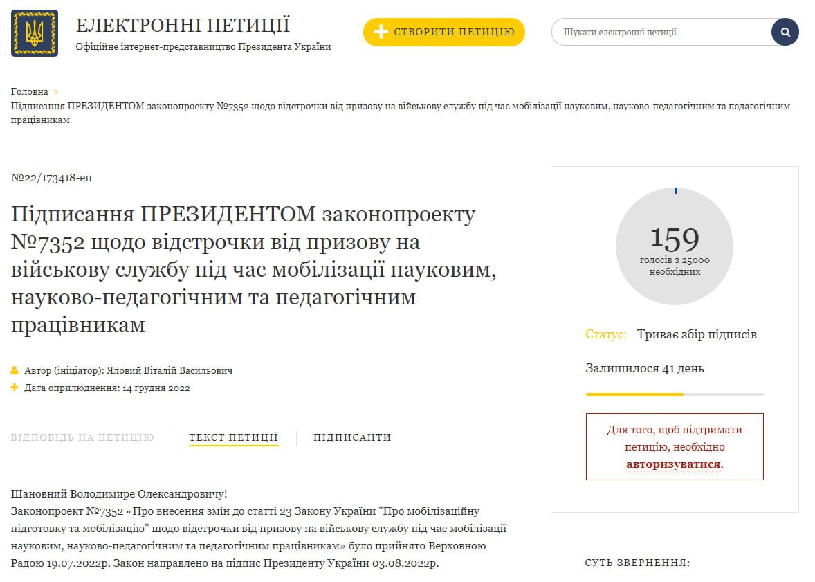 11.34 На сайте президента появилась петиция с требованием к Зеленскому подписать законопроект об отсрочке от мобилизации для научных, научно-педагогическим и педагогическим работникам.