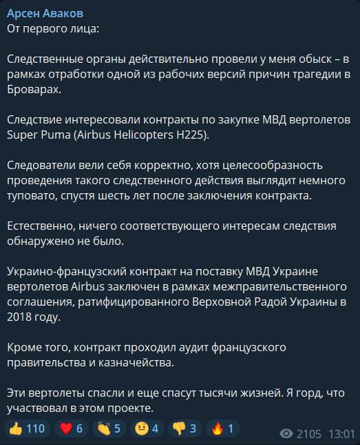 «Закончили обыск по аварии вертолёта. Смотрели контракты аирбас 6 летней давности. Естественно ничего. Контракты же утверждались правительством и парламентом. Коректно вели, хоть и бессмысленно тупо. Формально отработали версию», - сказал Арсен Аваков.