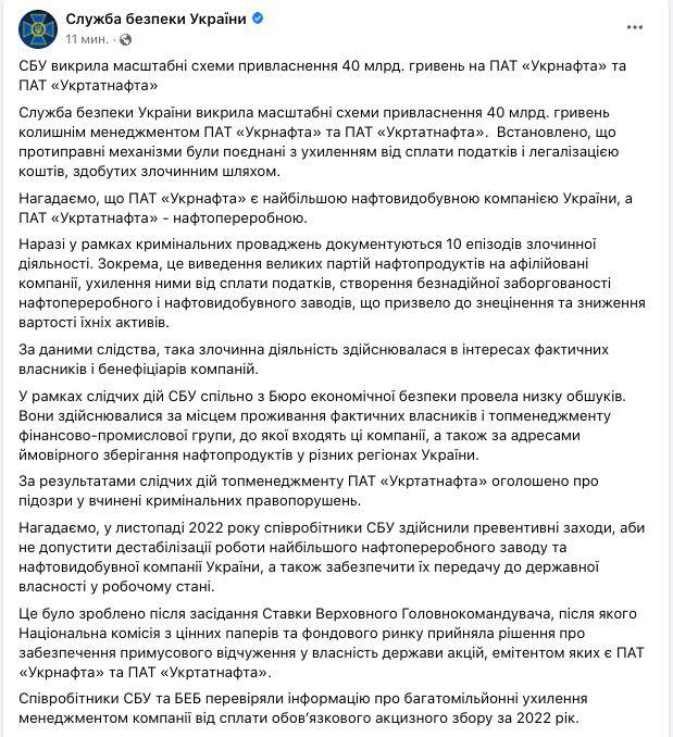 Источники «Страны» сообщают, что расследование идет по махинациям в «Укртатнафте» и «Укрнафте». Речь идет о растрате нефтепродуктов на 40 млрд гривен и уклонении от уплаты таможенных платежей на крупные суммы.