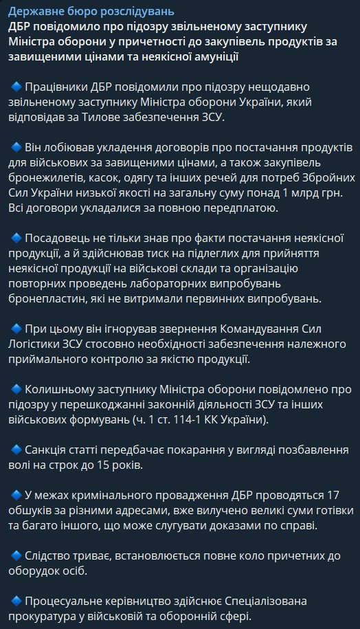 Также источники сообщают, что это не единственный фигурант, по которому сейчас работает Служба безопасности – обыски проходят и у других чиновников, вручают подозрения в коррупции в военной сфере на разных уровнях.