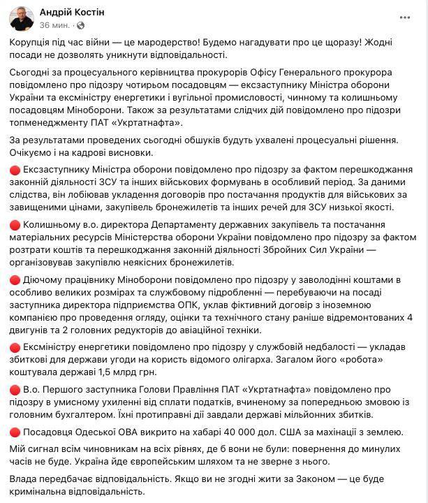 Также объявлено о подозрении экс-министру энергетики (Речь, как мы уже писали, идёт о Насалике - Ред.).