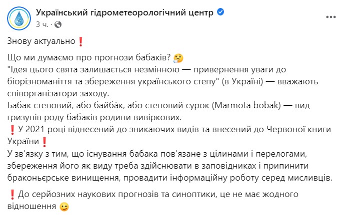 В Украинском гидрометцентре напоминают, что День сурка - это праздник, главная цель которого - привлечь внимание к исчезновению вида (обитающие в Украине степные байбаки - исчезающий вид сурков, занесенный в Красную книгу).