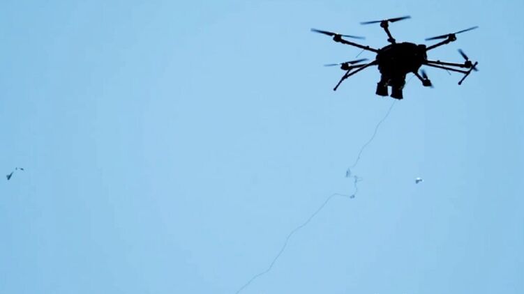 На видео видно, как беспилотник выбрасывает сеть, в которой запутывается вражеский БПЛА и падает.
