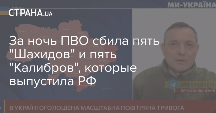 Также уничтожены пять из шести "Калибров", которые атаковали Украину этой ночью, добавил Игнат.