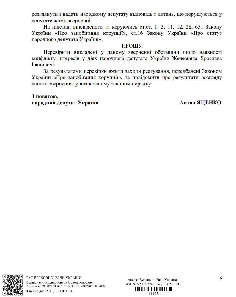 Народный депутат Антон Яценко написал в связи с этим обращение в Нацагентство по предотвращению коррупции (НАПК) с требованием проверить действия нардепа Ярослава Железняка на предмет наличия конфликта интересов.