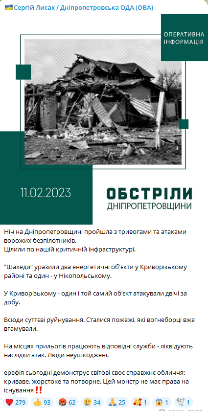 Напомним, что 9 февраля оккупанты запустили на область партию "Шахедов", однако все они были сбиты силами ПВО. Позже на Днепропетровскую область полетели ракеты. И в Криворожском районе было попадание в объект энергетической инфраструктуры.